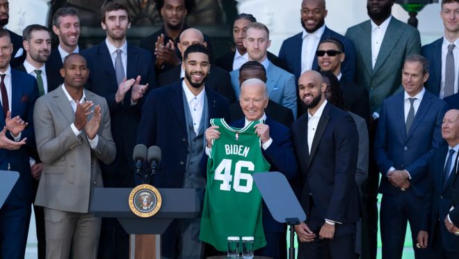 上一支造訪白宮的NBA冠軍球隊(duì)是凱爾特人隊(duì),他們?cè)?024年6月?lián)魯∵_(dá)拉斯獨(dú)行俠隊(duì)奪冠后,于2024年11月前往白宮。當(dāng)時(shí)的總統(tǒng)是拜登。