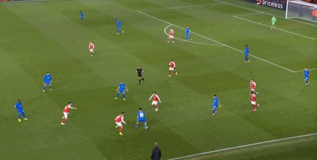 但是,隨著隊(duì)形的向前,三線的距離就會變得難以保持,這是面對比分落后的球隊(duì)最難以處理的問題,也是比分領(lǐng)先的球隊(duì)需要把握的機(jī)會,所以到了下半場,阿森納依然可以通過長傳球打進(jìn)兩線之間,從而銜接射門: